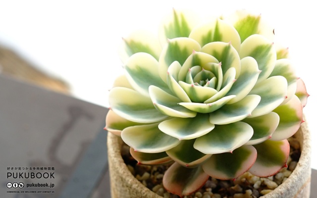 かつて1株1万円を超えるバブリーな値段がついた生きた宝石の正体は、北カリフォルニアにお住まいのレノアディーンさん宅に、ある日突然舞い降りた天使。生まれははっきりしているけど元の種は諸説あり、インブリカータ E. 'Imbricata' の斑入り種というサイトもありますが、ICNでは明確に否定されています。セクンダの血筋か、どうしても木立ちする性質があります。カキコによっては斑の入り方が偏って出ることがあります。「玉蝶錦」というのは中国での流通名で、セクンダ系の「グラウカ E. glauca」の名前を引き継いでいるのかもしれませんが、日本では「ルノーディーン」だけで通してほしいところ。夏越しがかなり難しく、エケベリア最難関クラス。一年草だと割り切っていらっしゃる方もいます。