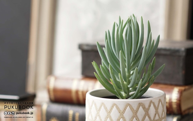 ブルーグレイの細い丸断面の葉っぱを立てにバサバサと伸ばす爽やかな印象の多肉植物。普及種でホームセンターでもよく見かけます。マンドラリスカエ S. mandraliscae に似ているけどこちらのほうが細長い雰囲気。これが根塊になってくるとチレコドンのワリチー T. wallichii かな。